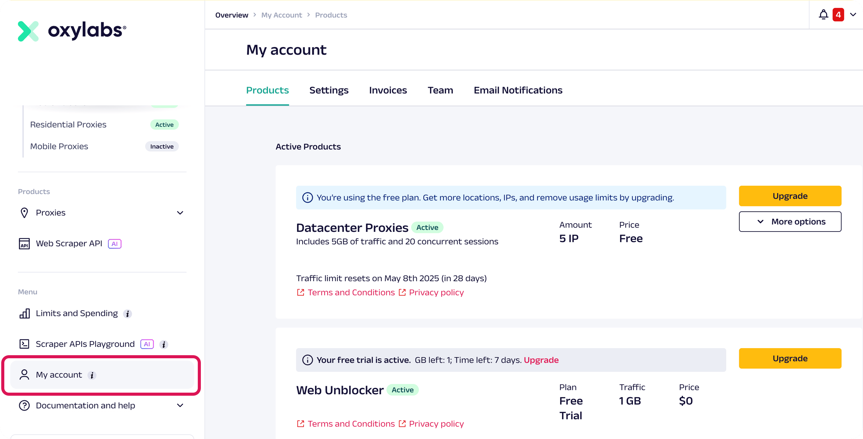 In the **Products** section, you'll see: