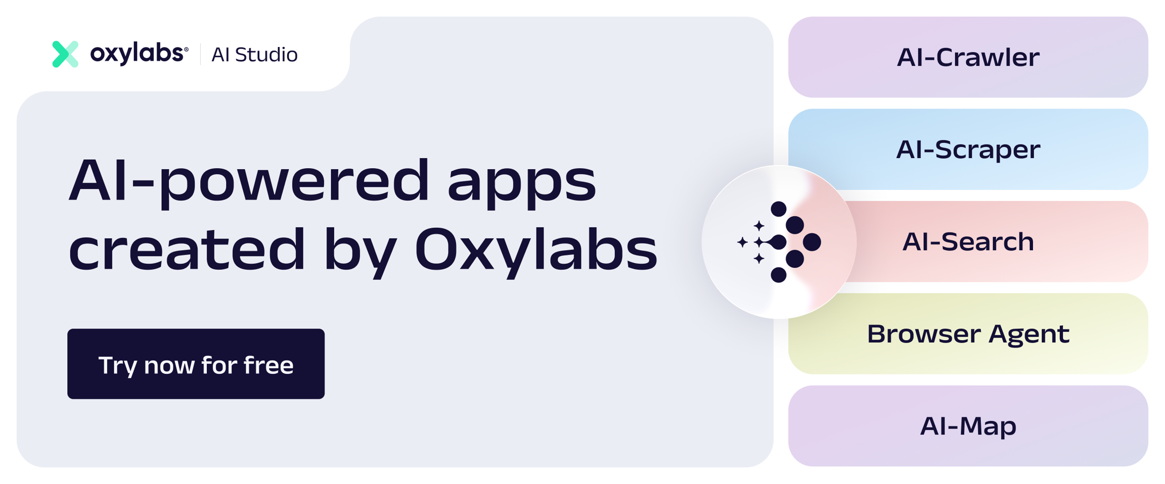 我们提供一个 JavaScript SDK,用于与 Chrome DevTools Protocol (CDP) 无缝交互 Oxylabs AI Studio API 服务交互,包括 AI-Scraper、AI-Crawler、AI-Browser-Agent 以及其他数据提取工具。
