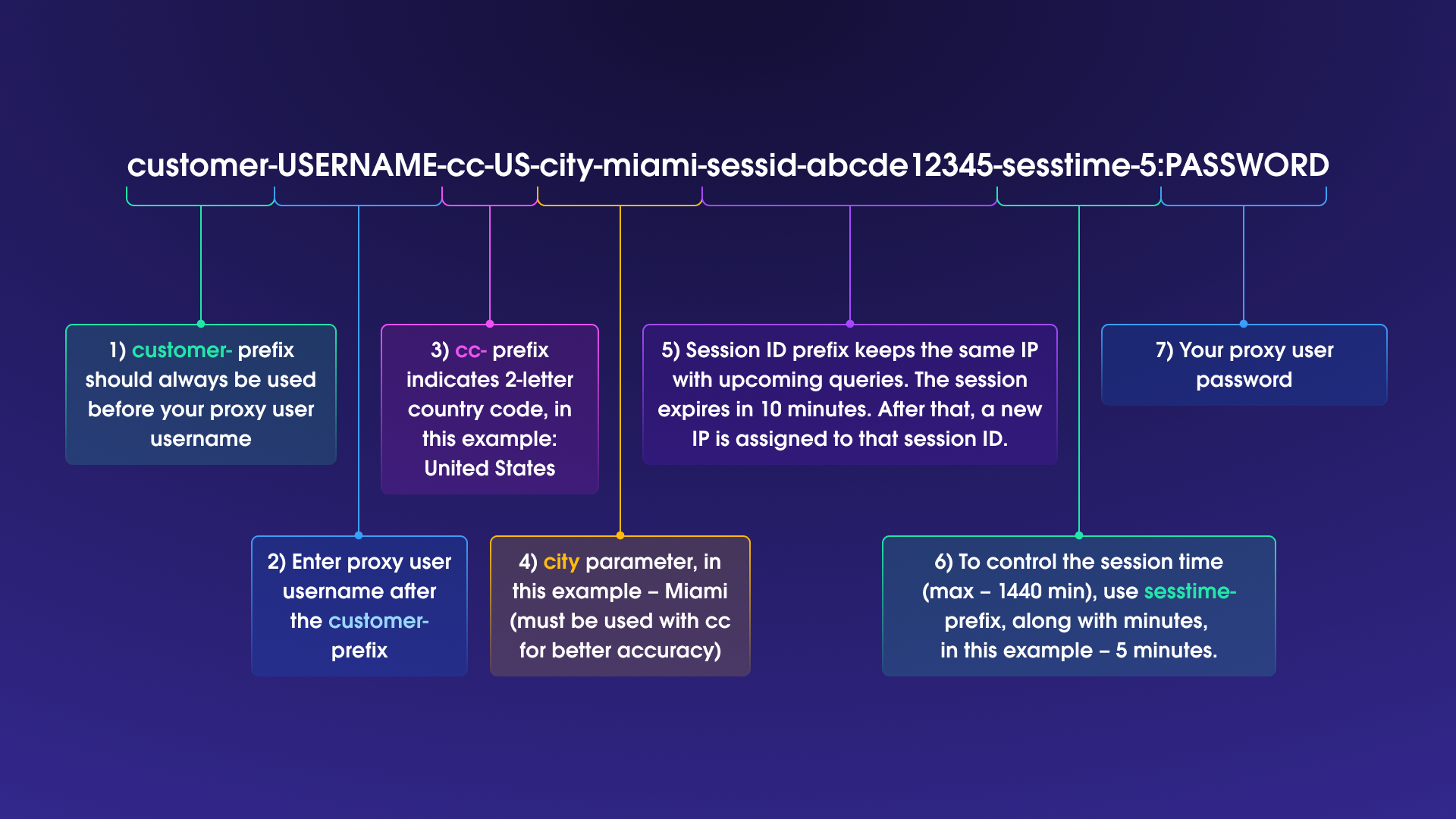 Un único proxy backconnect (`pr.oxylabs.io:7777)`te permite elegir un proxy específico por país o ciudad mediante parámetros adicionales en el username. Este enfoque también admite control de sesión. Aquí hay un ejemplo de credenciales: