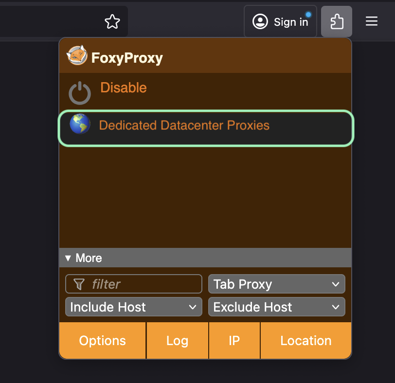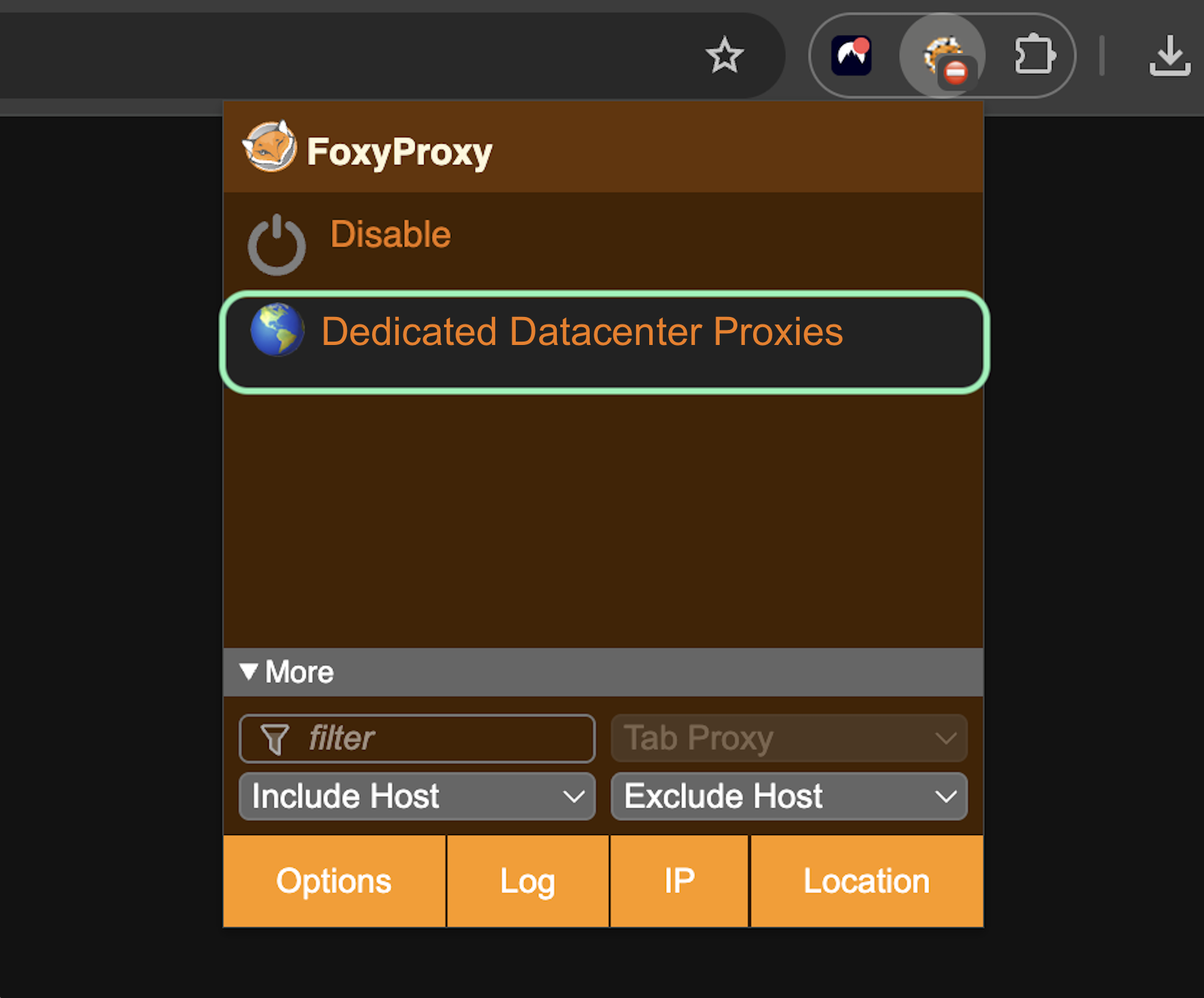 Para ativar um servidor proxy, clique no **ícone da extensão FoxyProxy** e depois clique novamente no seu **perfil de proxy** no menu suspenso.
