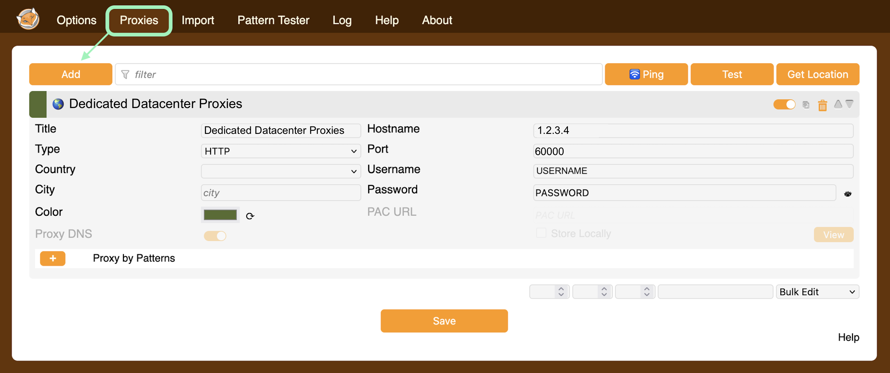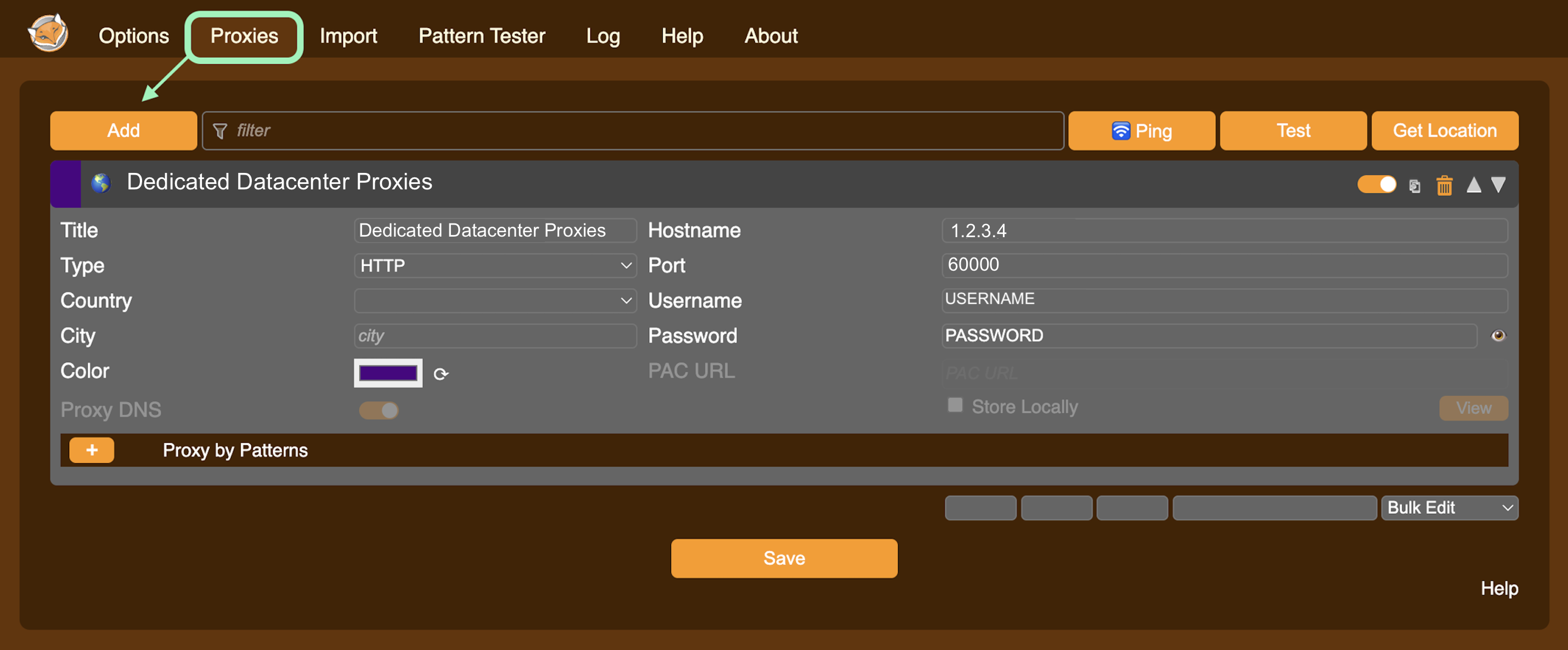Na **aba Proxies** clique no **botão Adicionar** localizado à esquerda para abrir as configurações do proxy. Em seguida, preencha a configuração dos seus Enterprise Dedicated Datacenter Proxies: