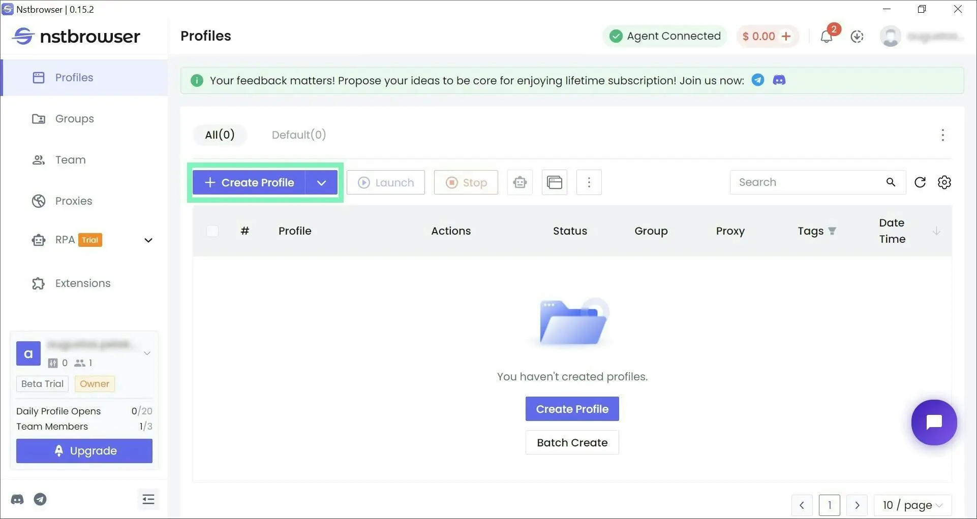 **Step 3:** On the home screen, select **+ Create Profile**.