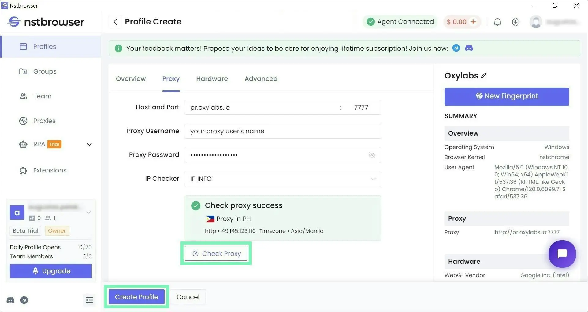 **Step 8:** **Check Proxy** to test the connection and **Create Profile** to finish the setup.