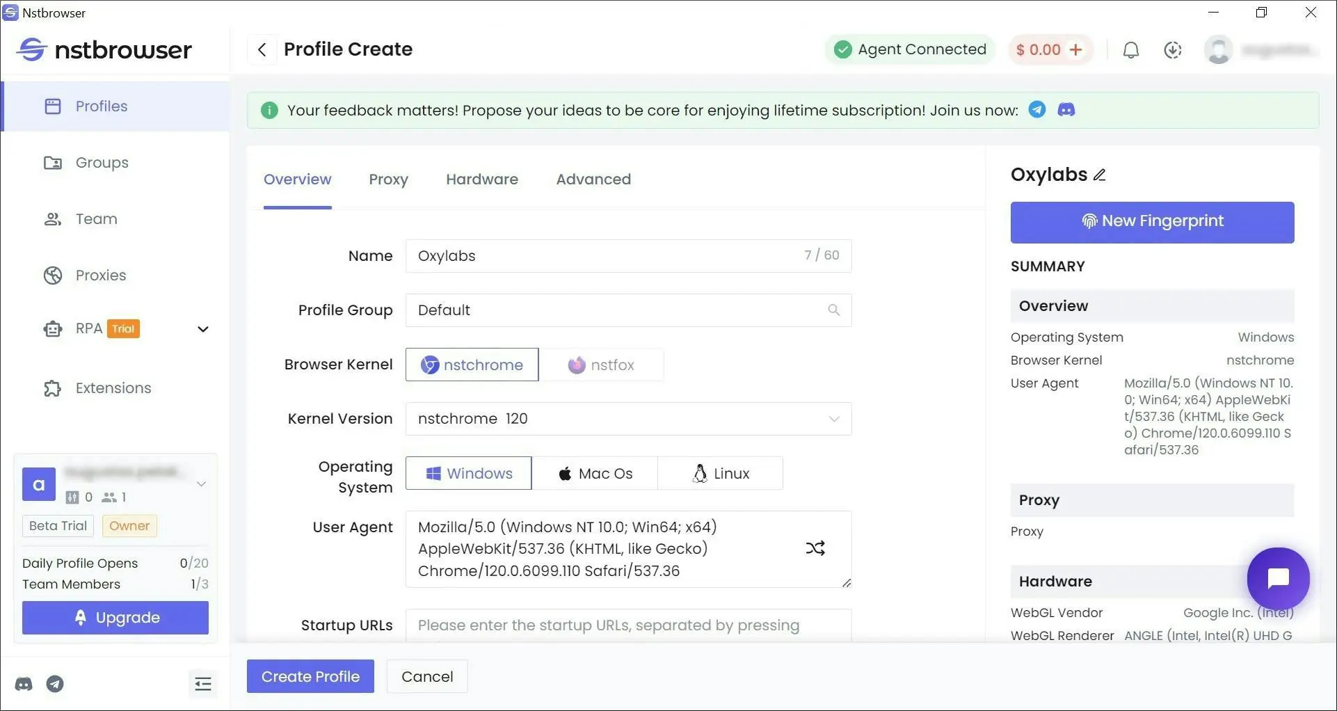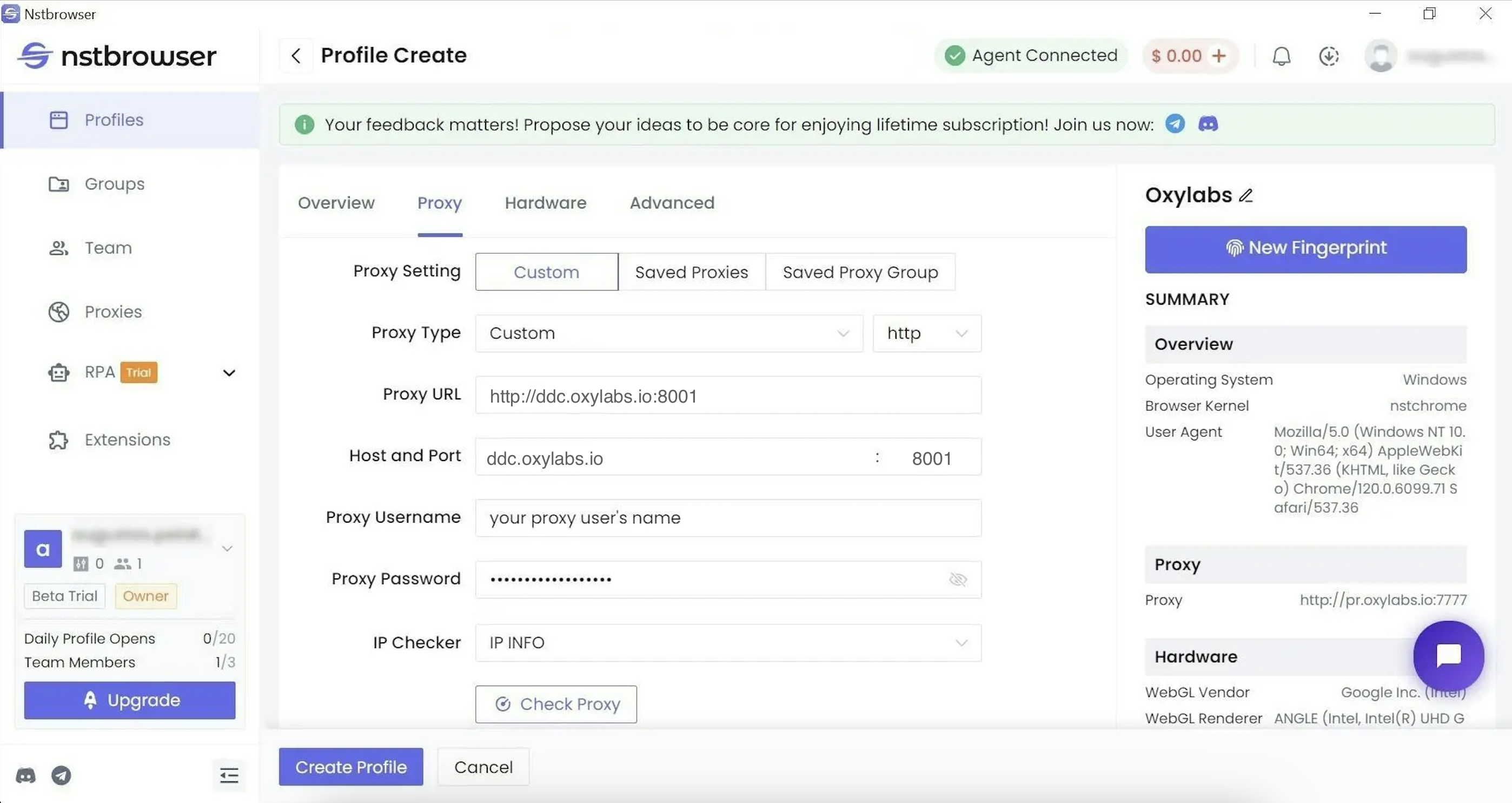 **Step 4:** Customize your digital fingerprint, including the **Proxy** settings.