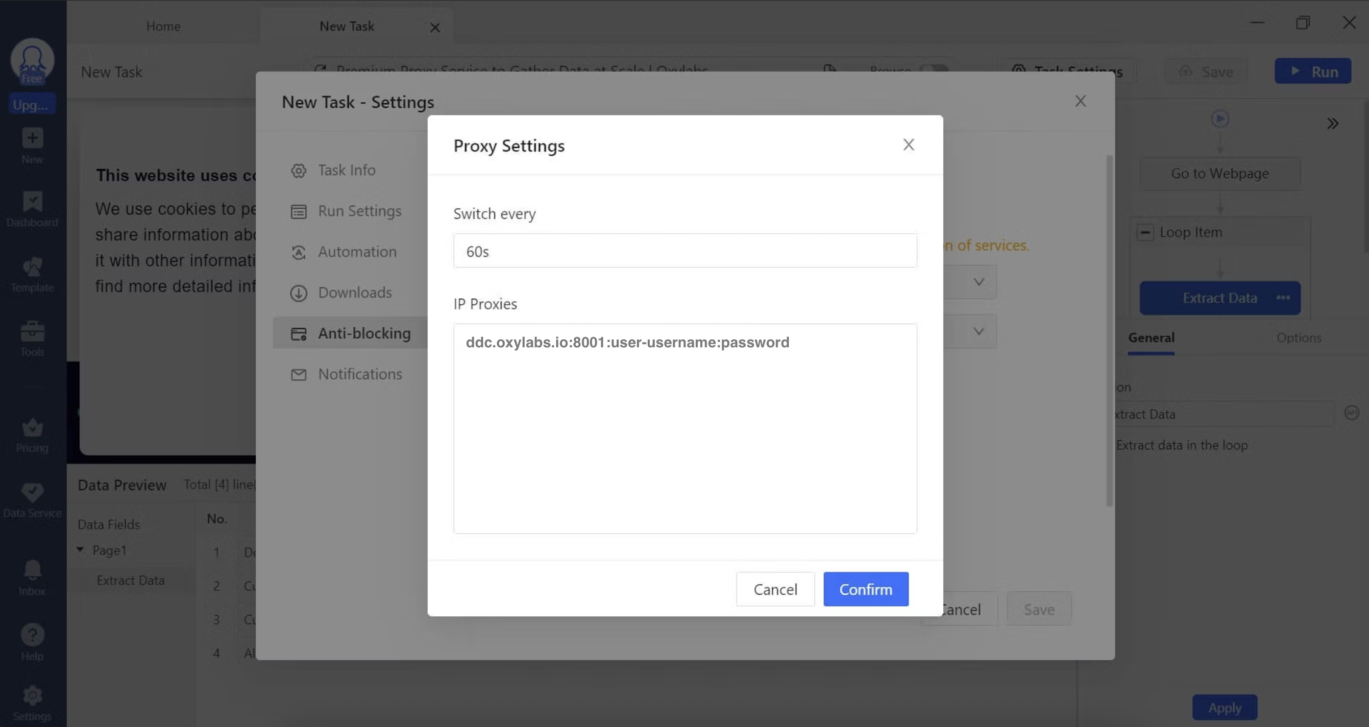 To integrate Octoparse with Oxylabs [**Dedicated Datacenter Proxies**](https://oxylabs.io/products/datacenter-proxies/dedicated-datacenter-proxies)**,** follow the simple steps below: