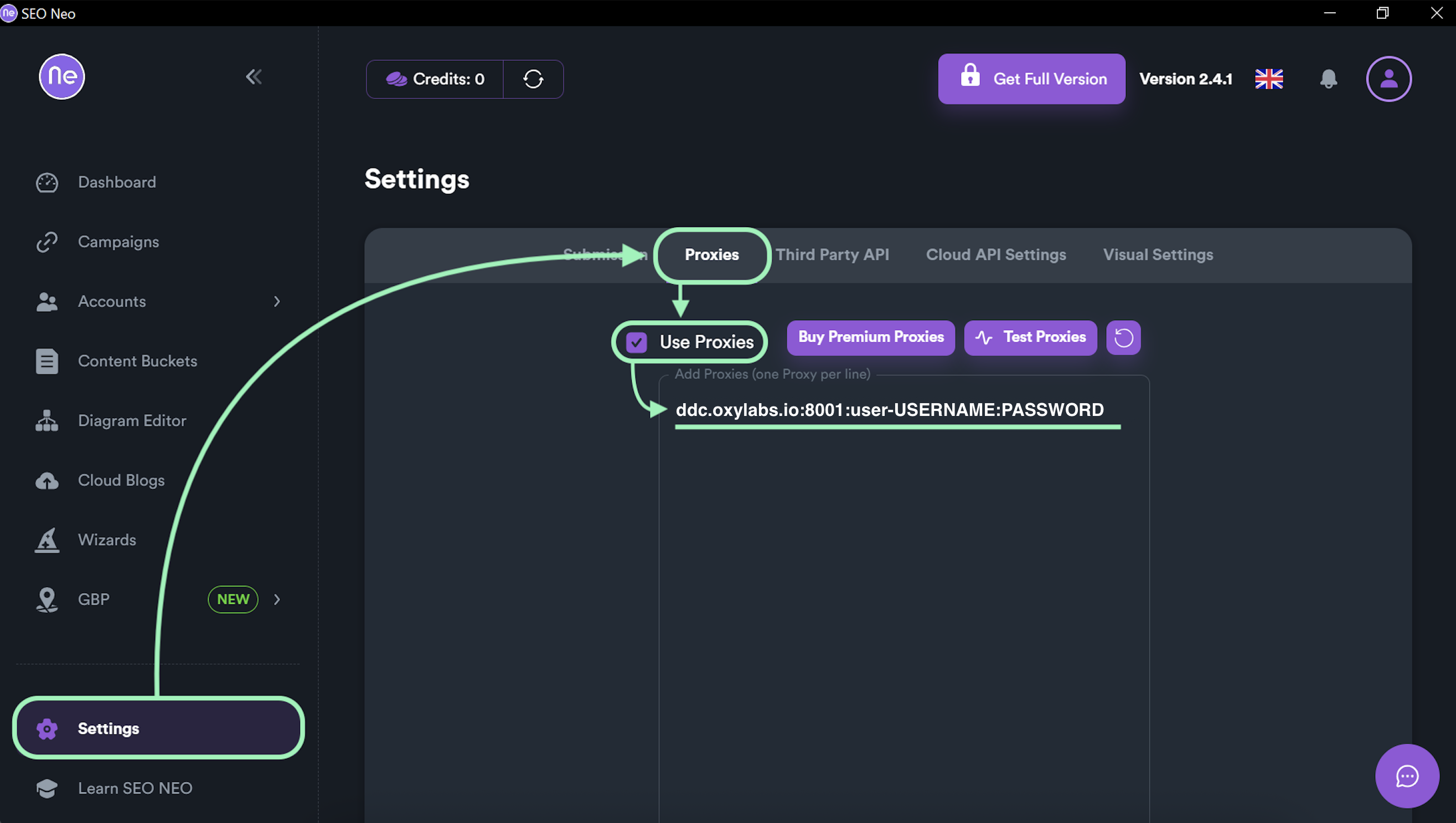 Once you've installed SEO Neo and logged in to the application, go to **Settings → Proxies** and enable proxies by clicking the **Use Proxies** checkmark.