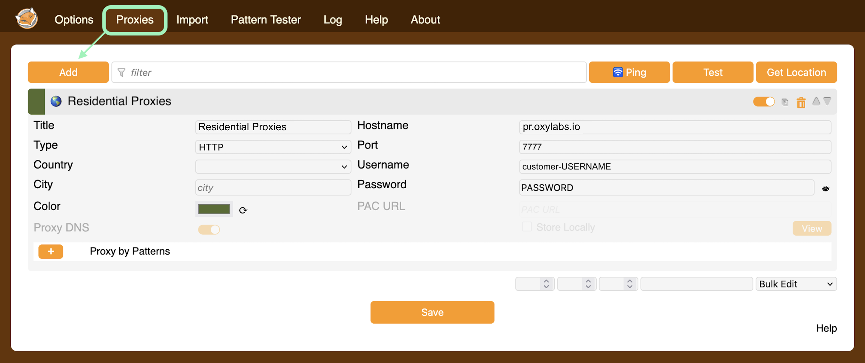 In the **Proxies** tab, click the **Add** button located on the left to open proxy settings. Then, fill in your Residential Proxies configuration: