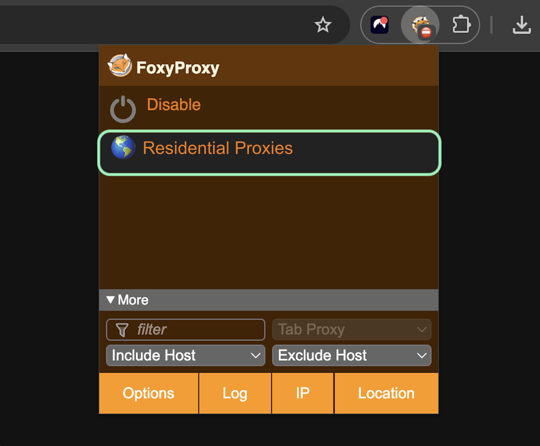 To activate a proxy server, click on the **FoxyProxy extension icon** and then click again on your **proxy profile** from the drop-down menu.