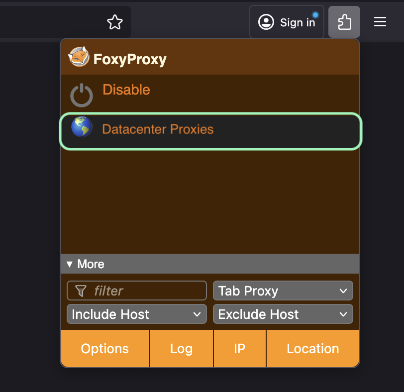 To activate a proxy server, click on the **FoxyProxy extension icon** and then click again on your **proxy profile** from the drop-down menu.