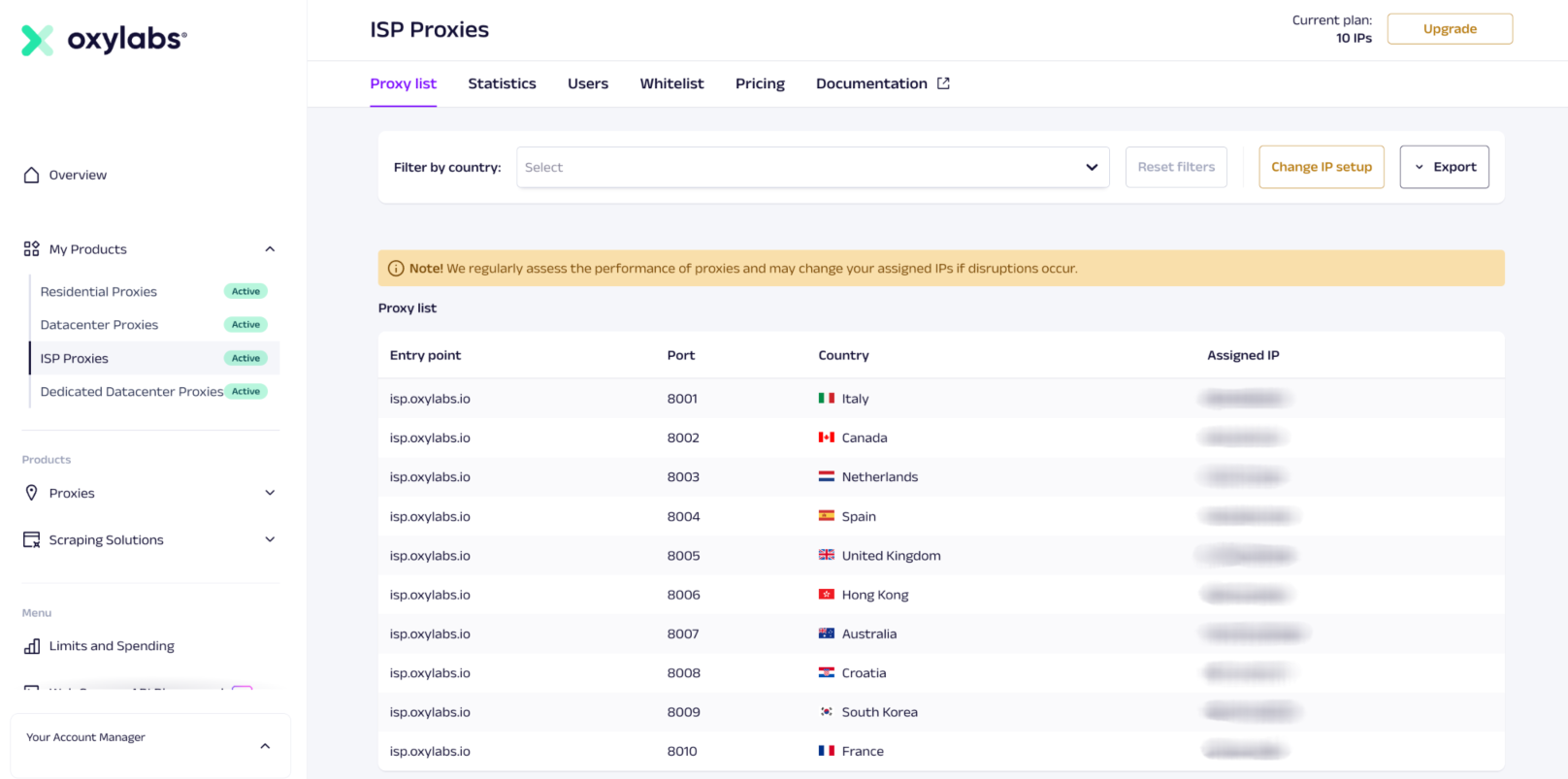 Find the complete list of your purchased proxies under **My Products** -> **ISP  Proxies** -> **Proxy list** menu in the dashboard. You can also conveniently export your proxy list in JSON or CSV formats.