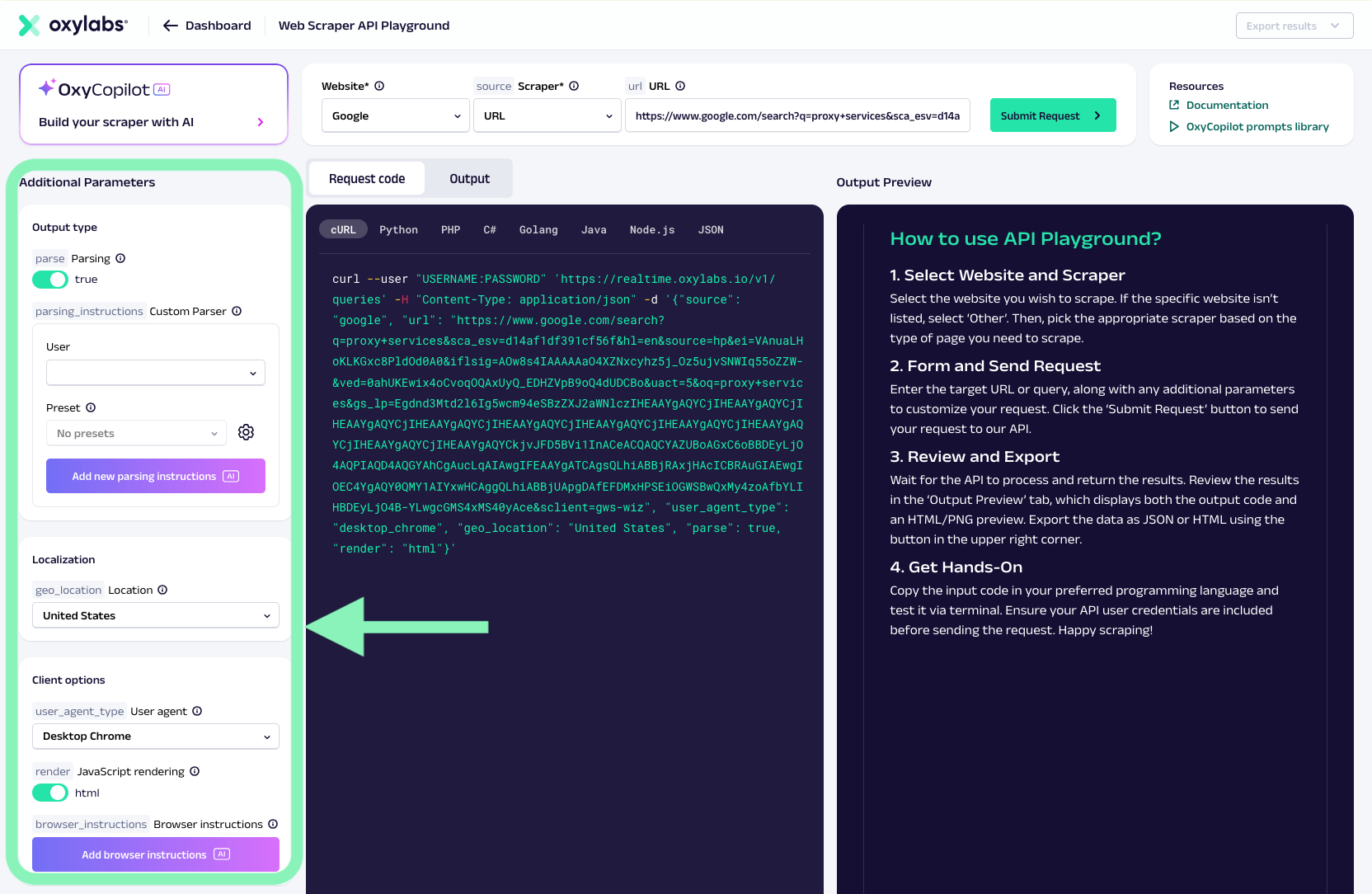 Master the Web Scraper API Playground to build and test requests. Prototype scrapers, use OxyCopilot for AI parsing, and export code snippets.